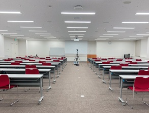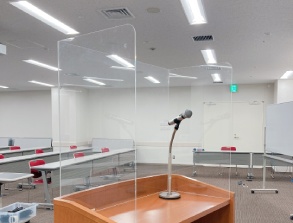 スクリーン、プロジェクター、ワイヤレスマイク(ハンド)、演台、ホワイトボード、ノートPC、オーディオインターフェイス、ビデオキャプチャ、ビデオカメラ、飛沫感染防止パネル