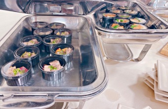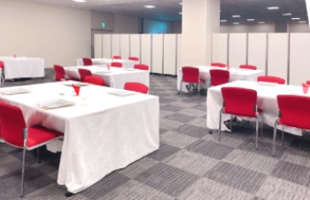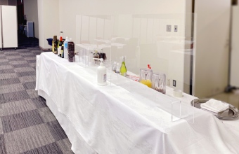 国内大手国際物流企業グループ会社様に社内会議と懇親会の会場として3階ホールアネックスをご利用いただきました。会場半分を着席スタイルの懇親会スペースとして、もう半分を会議スペースとしたレイアウトでした。会議は国内の別拠点をビデオ会議ソフトで繋ぎ、密を避けたレイアウトで行なわれました。また、懇親会は感染防止策として全て個食のポーション形式で提供いたしました。加温可能なケースも使用し、冷たいものは冷たく、温かいものは温かいまま美味しく召し上がっていただきました。当会場では感染防止策を徹底したパーティープランをご用意し、お客様が安心・安全にケータリングをお楽しみいただけるよう努めてまいります。