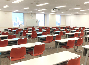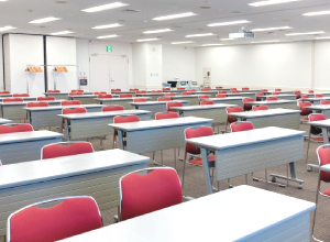 東京に本社を構える国内大手教育サービス企業のグループ会社様に試験の会場として10階会議室をご利用いただきました。当日は受験人数にあわせ大会議室を稼働間仕切りで区切りました。1つのテーブルに1人のレイアウト(写真はテーブル1つに椅子2つですが内1つは荷物置き用)で、受験者同士の距離をしっかりと確保し試験が行われました。会場には手指消毒用のアルコールスプレーをご用意した他、業務用の高度空気清浄機を設置し、新型コロナウイルス対策を十分におこない無事終了しました。