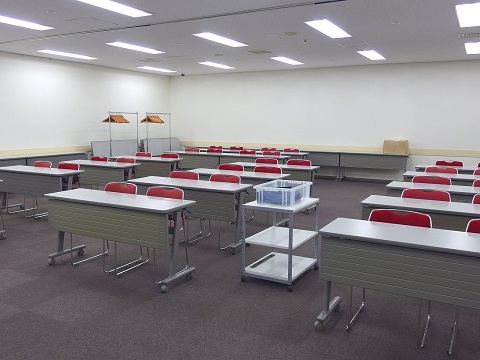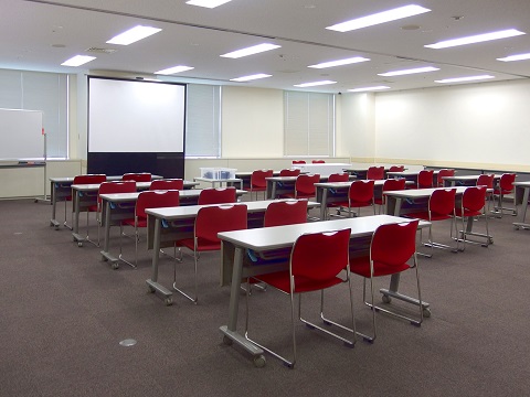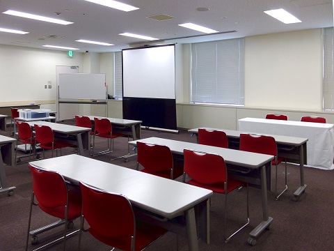 飲食業経営コンサルタント企業様に経営セミナーの会場として11階会議室をご利用いただきました。当日はプロジェクターを使用した映像教材とホワイトボードを併用してのセミナーでした。レイアウトに合わせ自立式スクリーンをご利用されました。当会場では天吊式・自立式スクリーンをご用意し、ご希望のレイアウトに柔軟に対応いたします。